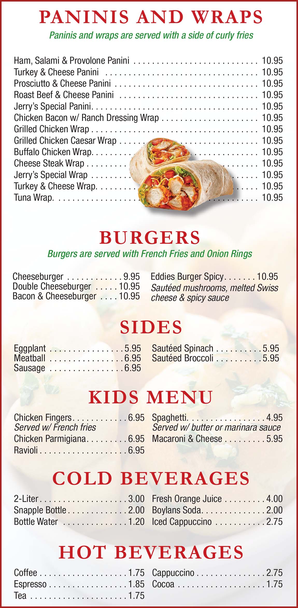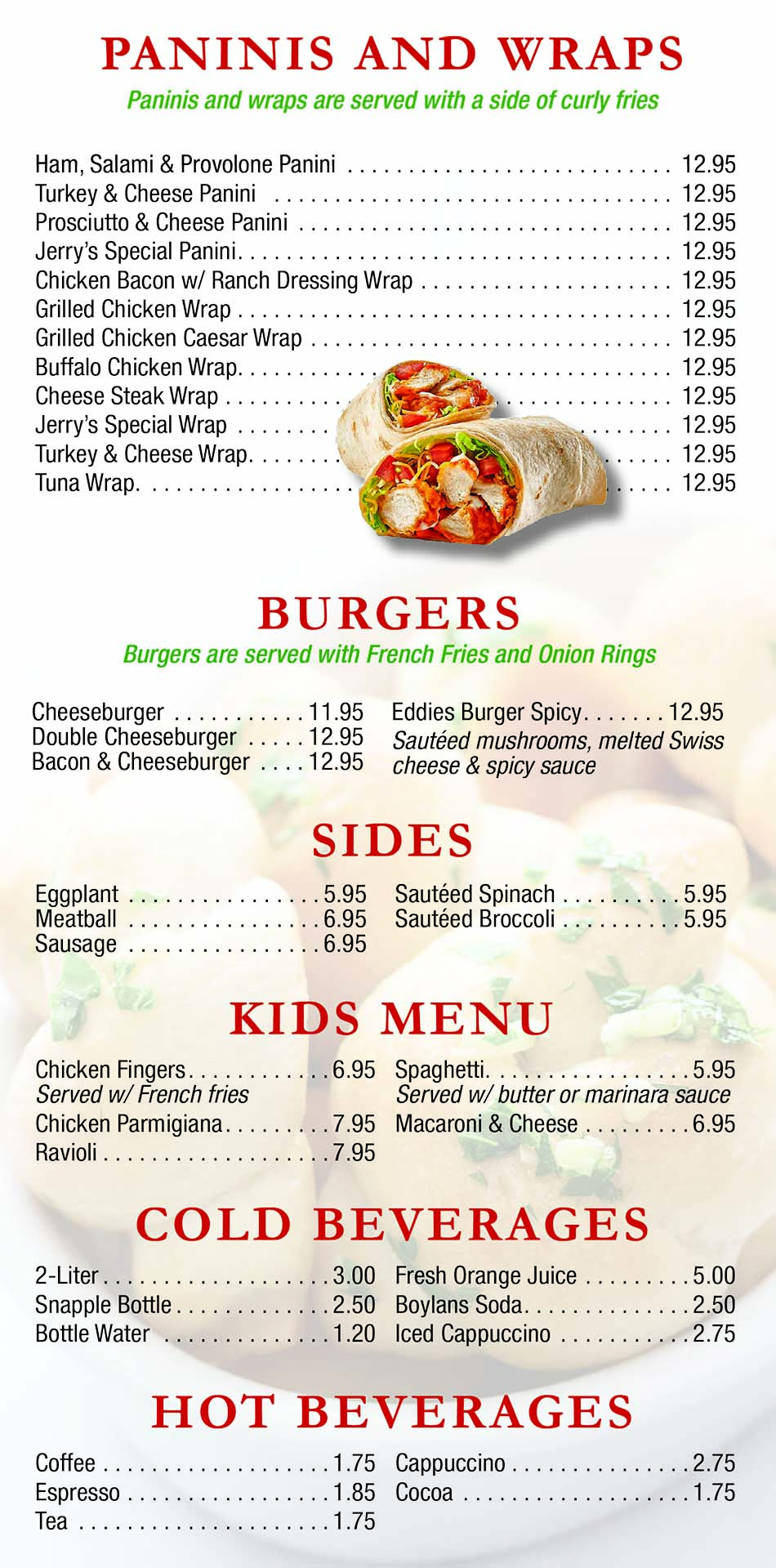 paninis/wraps/burgers